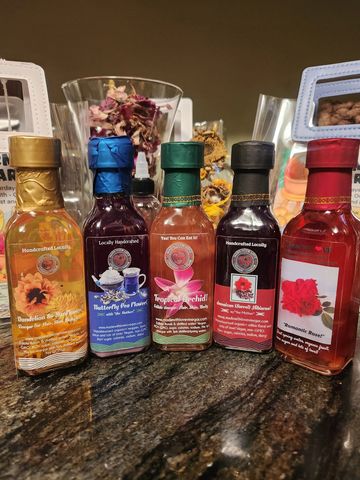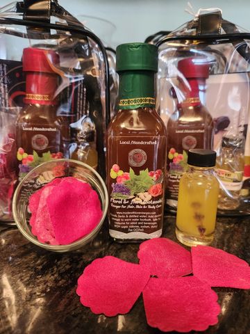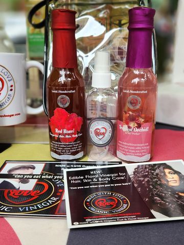 MwπFloral Vinegars includes Romantic Rose, Tropical Orchid, Captivating Calendula, Sunflower Dandelion, Jamaican Hibiscus Sorrell, Lavender and more! As an anti-bacteria, anti-fungal, one of vinegars many uses is hair-skin care. It cleanses, stops itching, shedding, eczema, detangles and extends hair color and makes hair shinny! Can you eat what you put in your hair?