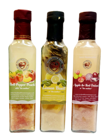 For salad with protein, these savory vinegars include organic herbs and spices! Also makes a delicious marinate on seafood or chicken! Trio Includes: Apple Red Onion, Peach Bell Pepper, Shishito Lemon Garlic Vinegars. Total 16oz.