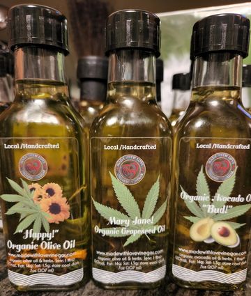 Specially infused extra virgin olive, avocado, and grapeseed oils. Selections include: "Happy!" Extra Virgin Olive Oil; "Mary Jane!" Grapeseed Oil; "Bud!" Avocado Oil; and "Hi!" EVOO, not shown, 7oz ea