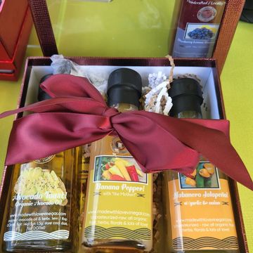 Need a gift for that special someone who has everything? Or, attending a dinner party? Order our beautiful Bow Box Trio that includes 2 Mwβ€οΈOrganic Vinegars and 1 Mwβ€οΈInfused Oil. Select: maroon, red, bronze or silver! Local delivery & Market pickup only.