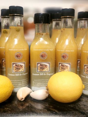 Organic lemon, dill, capers, onion, garlic and herbs make for a savory dressing and fish marinade. Includes Lemon Dill Caper with Rosemary, Basil, Thyme Extra Virgin Olive Oil, 15oz total. Market pickup only.